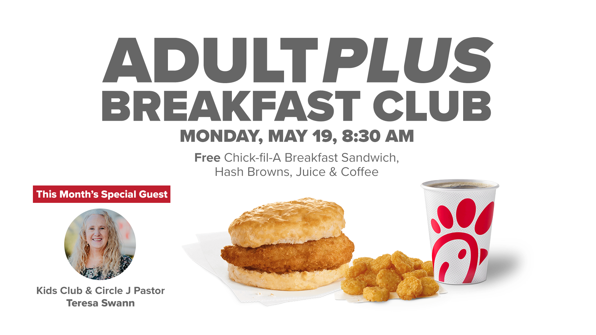 Those 60+ are invited to this month’s AdultPlus Breakfast Club on Monday, May 19, from 8:30 to 9:45 AM in room 116 of the Family Life Center at Victory’s North Lakeland Campus. Enjoy a FREE Chick-fil-A breakfast and an informative session with Teresa Swann, our Kids’ Club Pastor, who will introduce a fantastic way you can make a meaningful difference in this year’s Circle J summer camp program!