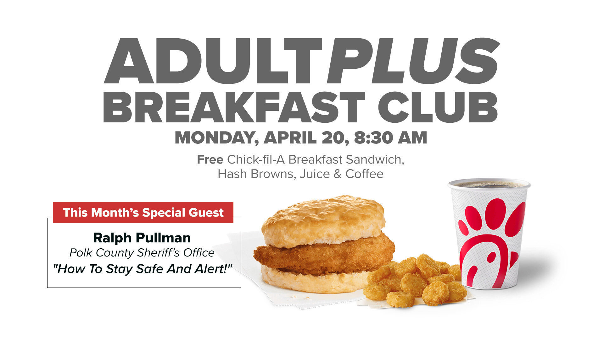 Come enjoy a delicious, free Chick-fil-A breakfast, plus hear a great session on Seniors Vs. Crime: "How To Stay Safe And Alert!" by Ralph Pullman from the Polk County Sheriff's Office!