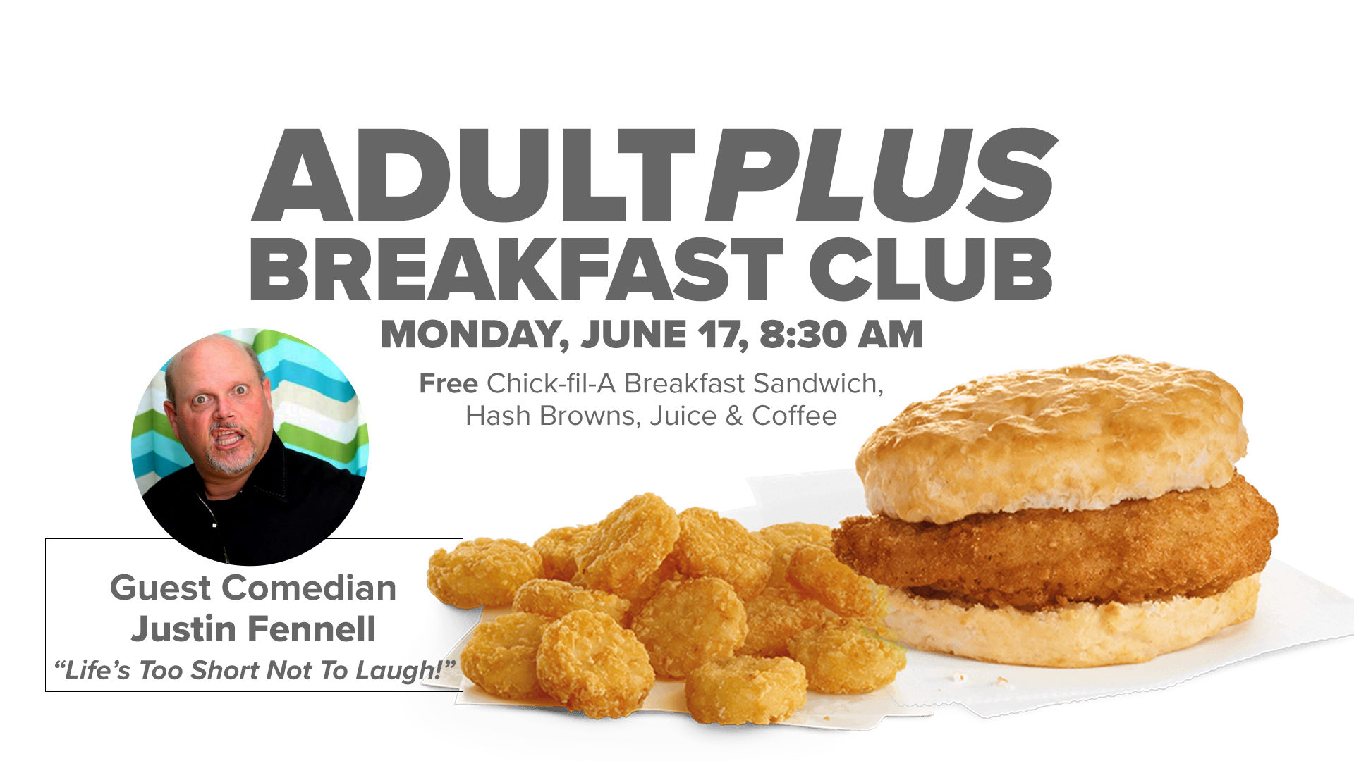 Enjoy a FREE Chick-fil-A breakfast meal and FREE Christian Comedian Justin Fennell on Monday, June 17, from 8:30-9:45 AM, in room 116 of the Family Life Center at Victory’s North Lakeland Campus.
