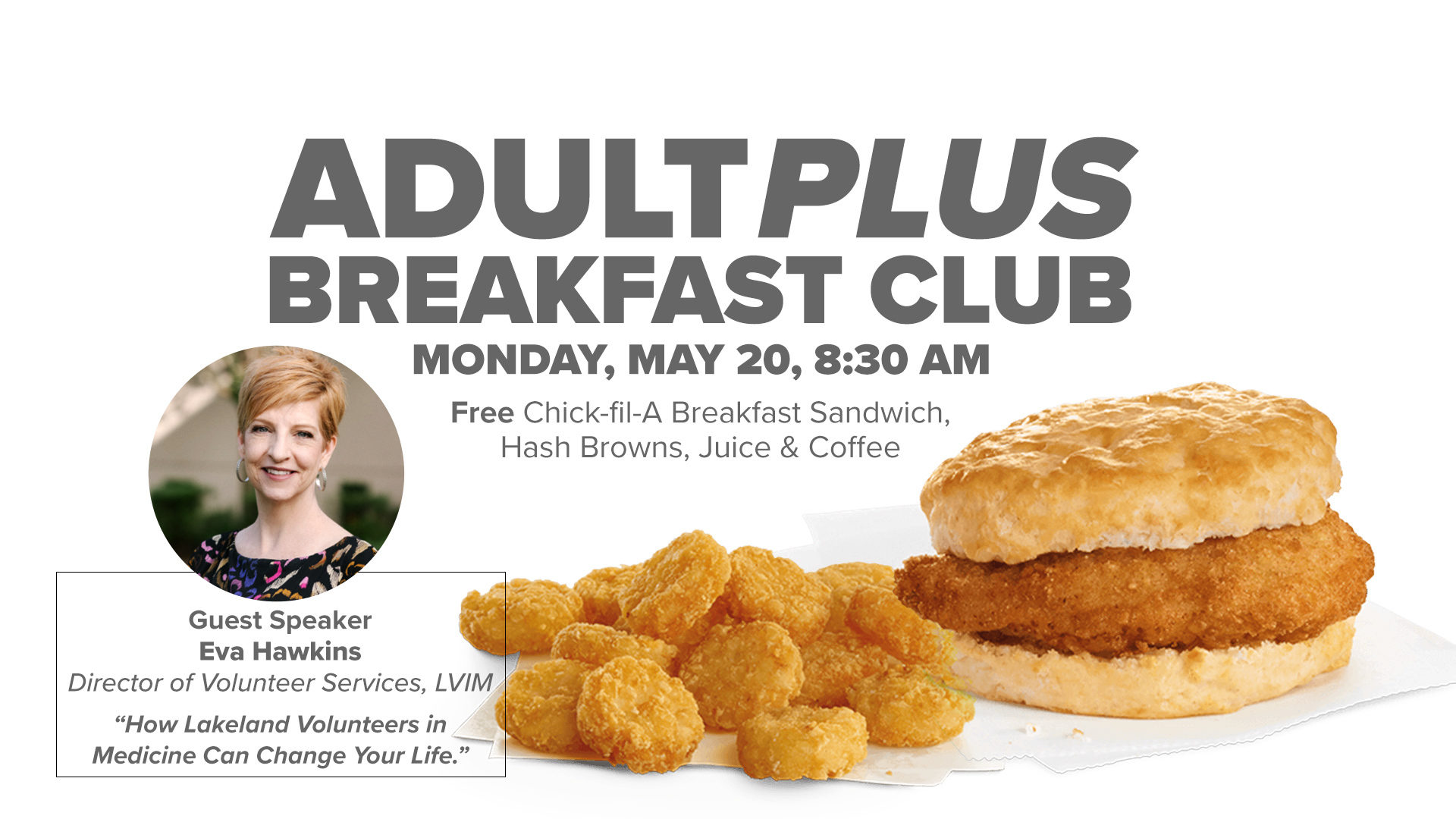 Everyone is invited to join the AdultPlus group for an informative and FREE Chick-Fil-A breakfast on Monday, May 20, from 8:30-9:45 AM, in room 116 of the Family Life Center at Victory’s North Lakeland Campus.