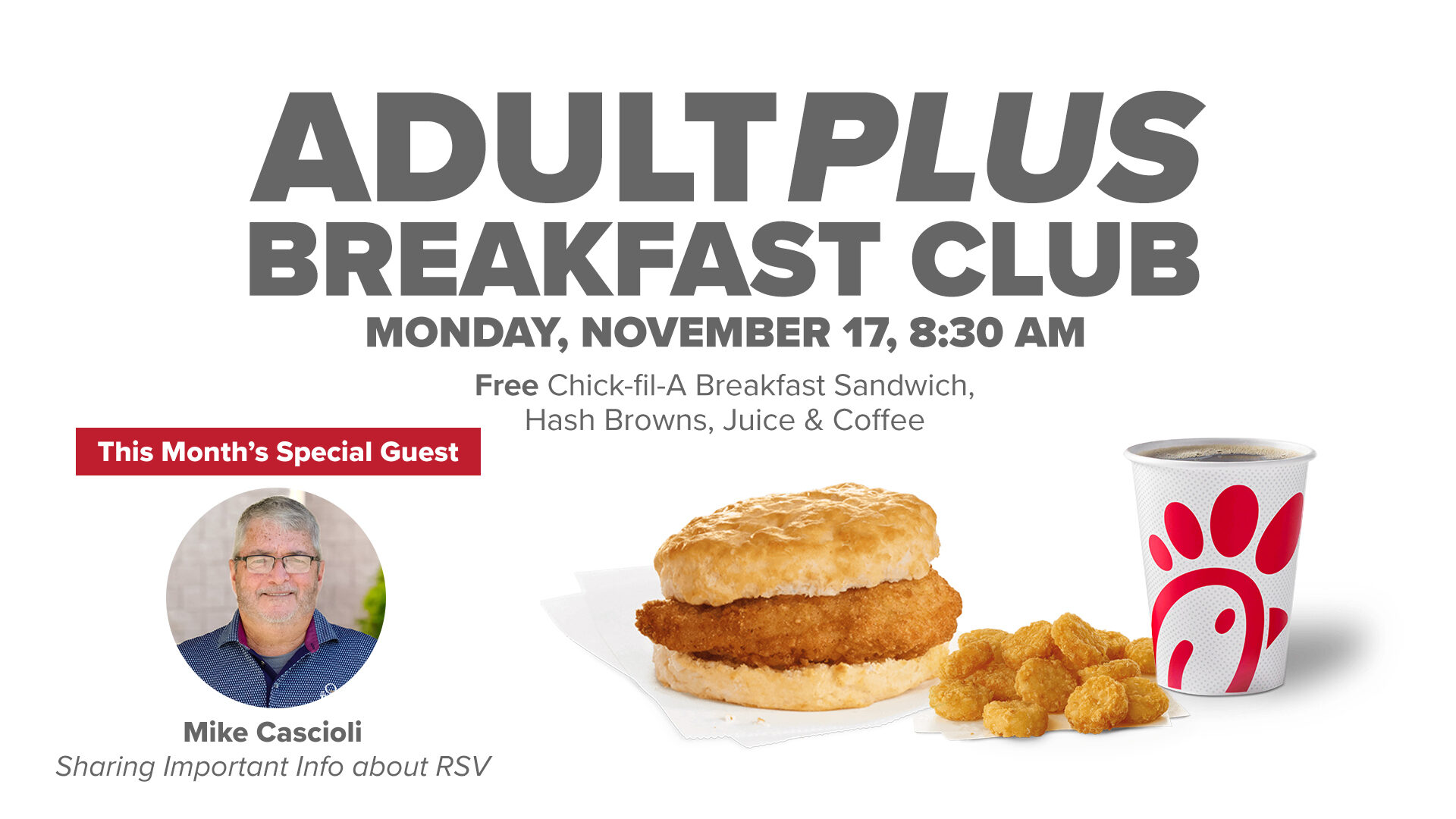 Those 60+ are invited to this month’s AdultPlus Breakfast Club on Monday, November 17, from 8:30-9:45 AM, in room 116 of the Family Life Center. Come enjoy a delicious, free Chick-fil-A breakfast, the opportunity to connect with great people, and hear from Mike Cascioli as he shares a presentation on a little-known but dangerous virus affecting seniors, RSV - "Understanding RSV (Respiratory Syncytial Virus) In Older Adults." Mike is a National Senior Games Athlete and an RSV survivor and will be presenting important information specific to seniors about preventing and treating this virus.