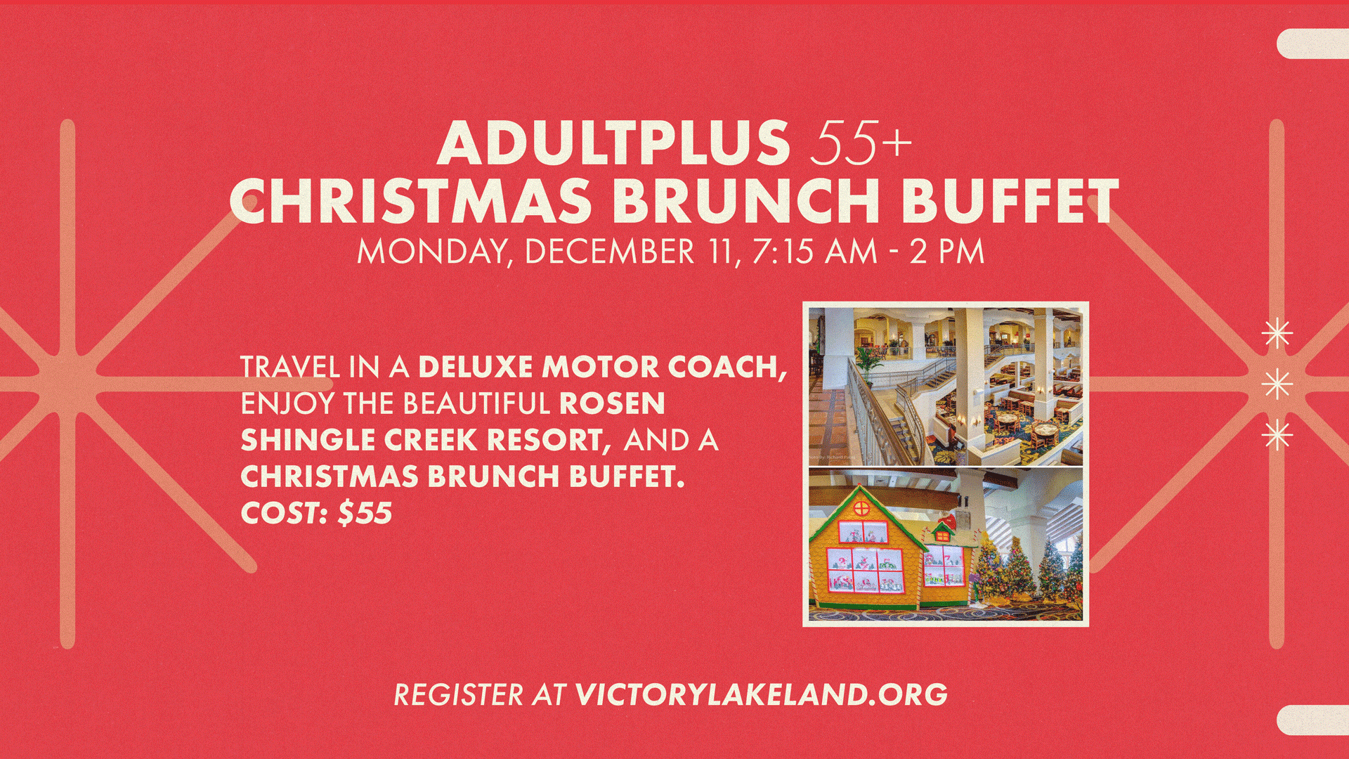 This trip includes a deluxe motor coach from the Victory Church parking lot to the beautifully decorated resort, plus the Brunch Buffet and gratuities. ALL YOU NEED TO DO IS SHOW UP!