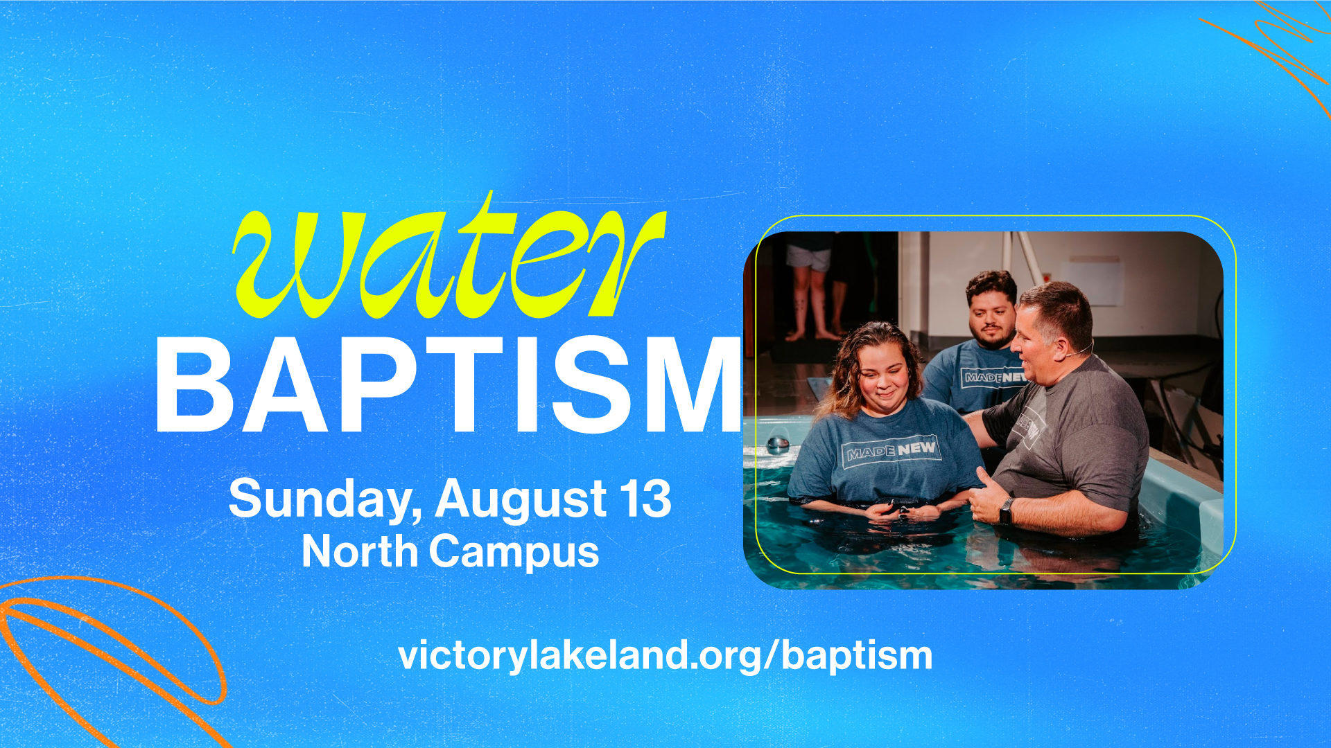 If you have decided to follow Jesus but have not yet been baptized, we invite you to be part of the Water Baptism celebration happening Sunday, August 13, at Victory's North Lakeland campus only.