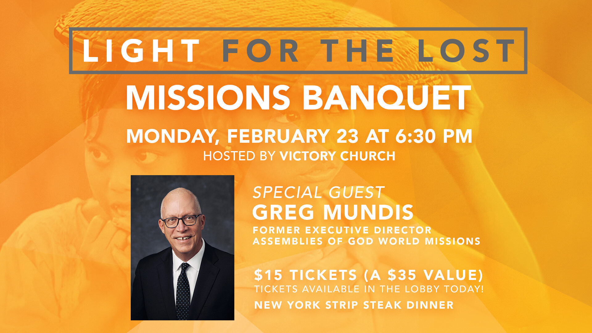 Coming up on Monday, February 23, at 6:30 PM, is our annual Light for the Lost missions banquet. This unique evening is an opportunity for you to hear a powerful update of what God is doing around the world from outstanding missionary speaker Dr. Greg Mundis!