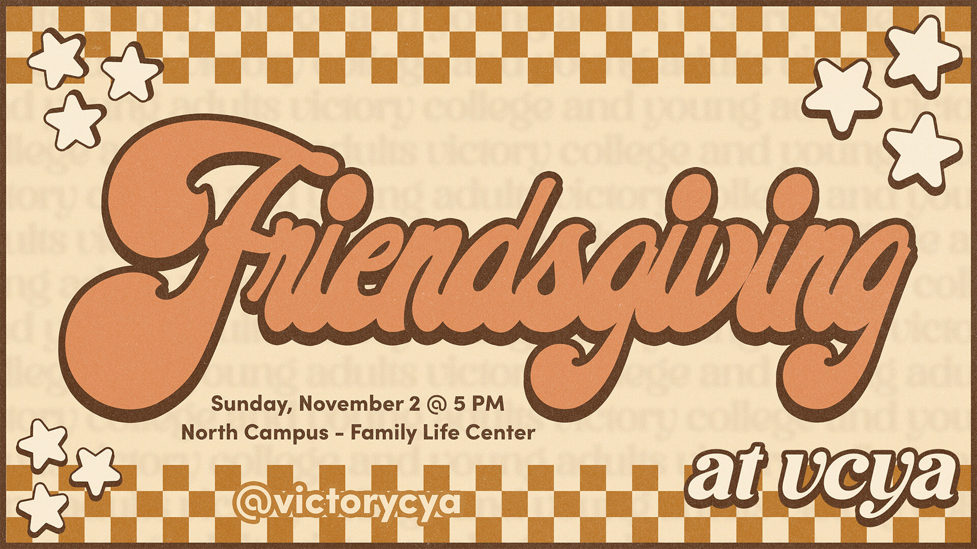 Those ages 18 to 30 who are ready for some fall traditions are invited to the annual Victory College and Young Adults Friendsgiving on Sunday, November 2nd, at 5 PM in the Family Life Center at Victory’s North Lakeland Campus. You’ll enjoy giveaways, games, worship, a message, and of course, a completely free, full Thanksgiving meal! It’s one of our favorite nights of the year, so invite your friends and register today to let us know you plan to attend.