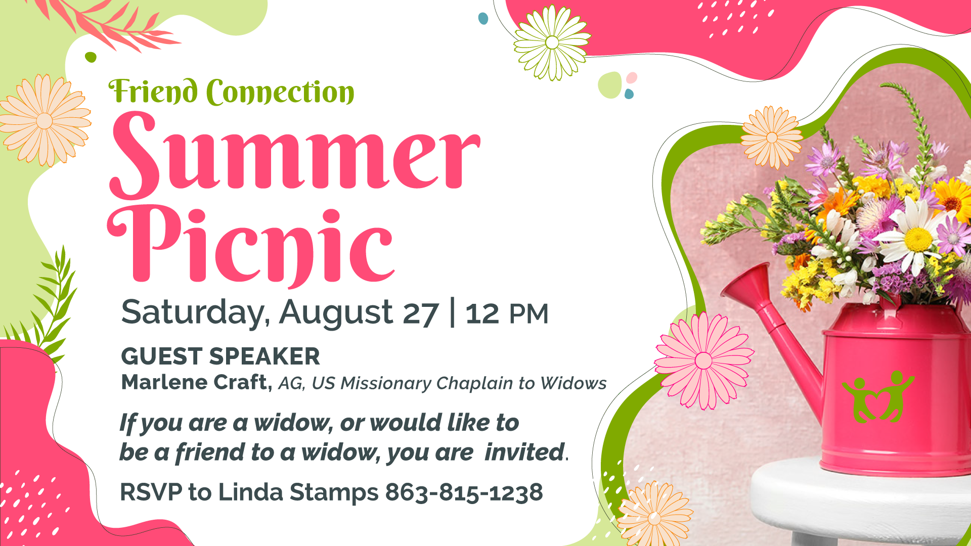 If you are a widow or would like to be a friend to a widow, you are invited to join us on Saturday, August 27, at Victory's North Campus Family Life Center, room 116, for a fun Summer picnic from 12 noon to 1:30 PM.