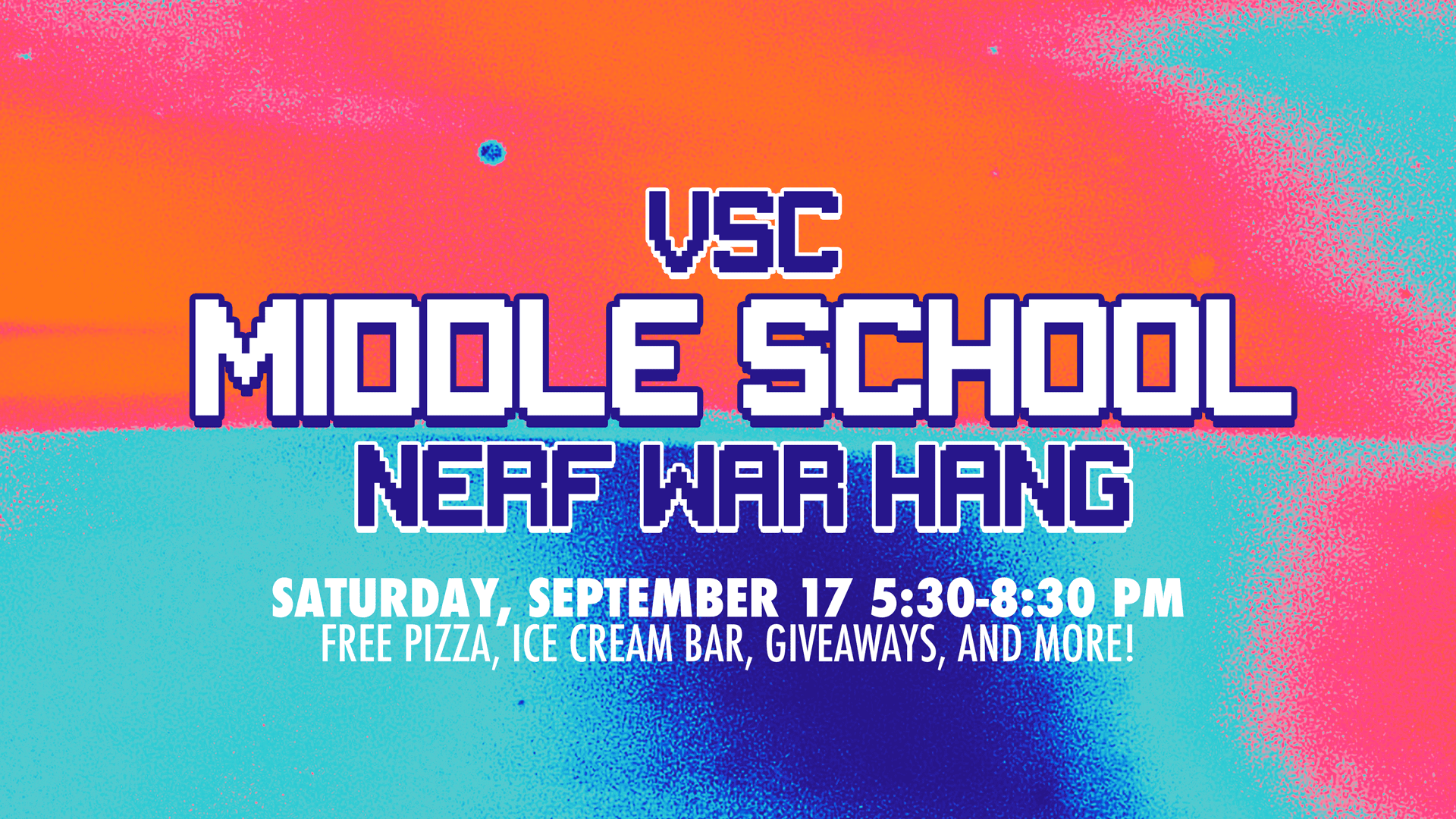 All middle school students are invited to the Family Life Center Gym at Victory's North Lakeland Campus Saturday, September 17, from 5:30 to 8:30 PM for the VCA Middle School Hangout and Nerf war!