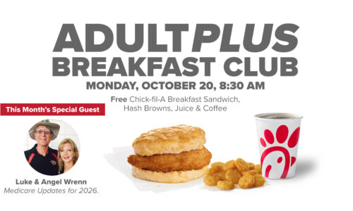 Those 60+ are invited to this month’s AdultPlus Breakfast Club on Monday, October 20, from 8:30-9:45 AM, in room 116 of the Family Life Center. Come enjoy a delicious FREE Chick-fil-A breakfast, the opportunity to connect with some great people, and to hear from Luke & Angel Wrenn as they share "Medicare Updates for 2026."