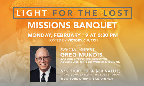 Everyone is invited to be part of the annual Light for the Lost Missions banquet happening Monday, February 19, at 6:30 PM. This unique evening is an opportunity for you to hear a powerful update of what God is doing around the world from Greg Mundis.