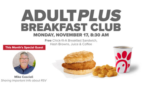 Those 60+ are invited to this month’s AdultPlus Breakfast Club on Monday, November 17, from 8:30-9:45 AM, in room 116 of the Family Life Center. Come enjoy a delicious FREE Chick-fil-A breakfast, the opportunity to connect with some great people, and to hear from Mike Cascioli as he shares important medical information about RSV.